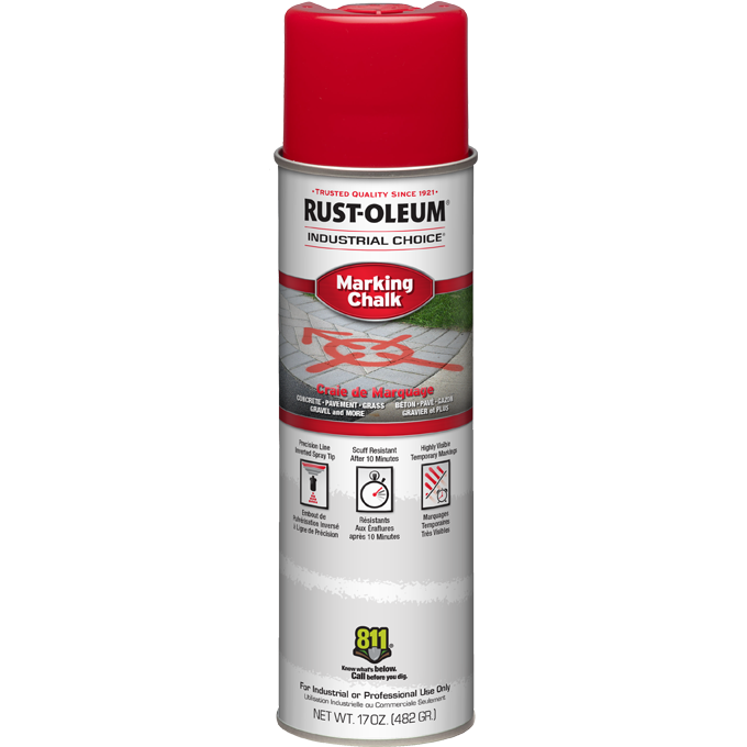 • Rust-Oleum‘s MC1800 System Inverted Marking Chalk is a high-performance, non-toxic marking solution designed for superior durability and resistance. This eco-friendly product is great for temporary marking applications on various surfaces, including concrete, pavement, grass, and gravel.
