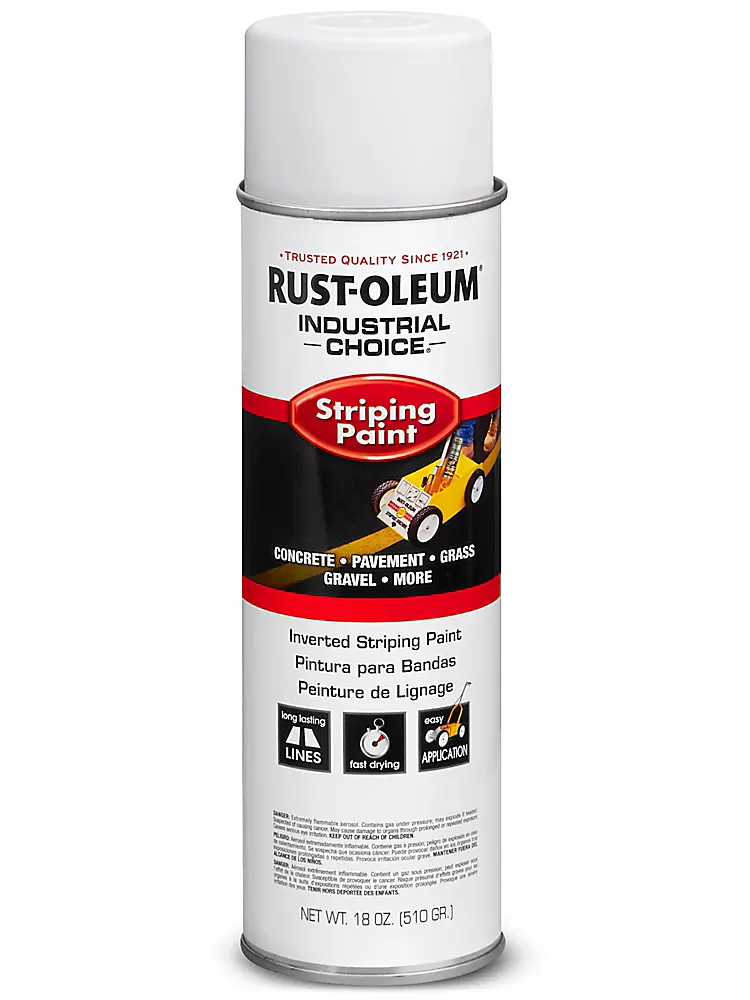 Rust-Oleum® High Performance Inverted Striping Paint is a lead-free aerosol paint that features weather and abrasion resistance for durability. When used with one of the RustOleum Striping Machines, these coatings are ideal for striping parking lots and warehouse aisles. They dry fast and adhere to concrete, pavement, gravel, grass and more.